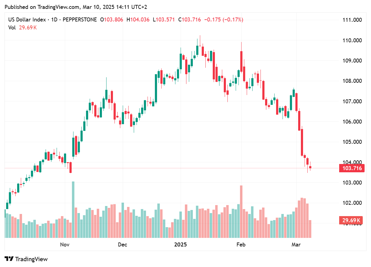 103.716. The US dollar experienced significant weakness last week, falling over 3% against major currencies to reach a four-month low. The dollar index (USDX), which measures the US currency against six others, dropped to 103.45, its lowest level since November 2024.