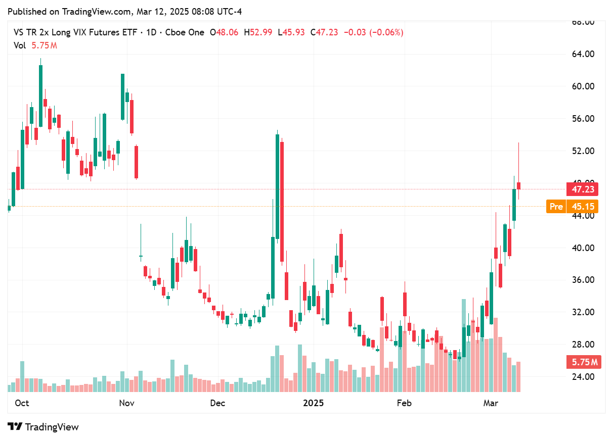 Below is UVIX. UVIX is the 2x Long VIX Futures ETF, a leveraged exchange-traded fund that seeks to provide daily investment results corresponding to twice the performance of the Long VIX Futures Index (LONGVOL).