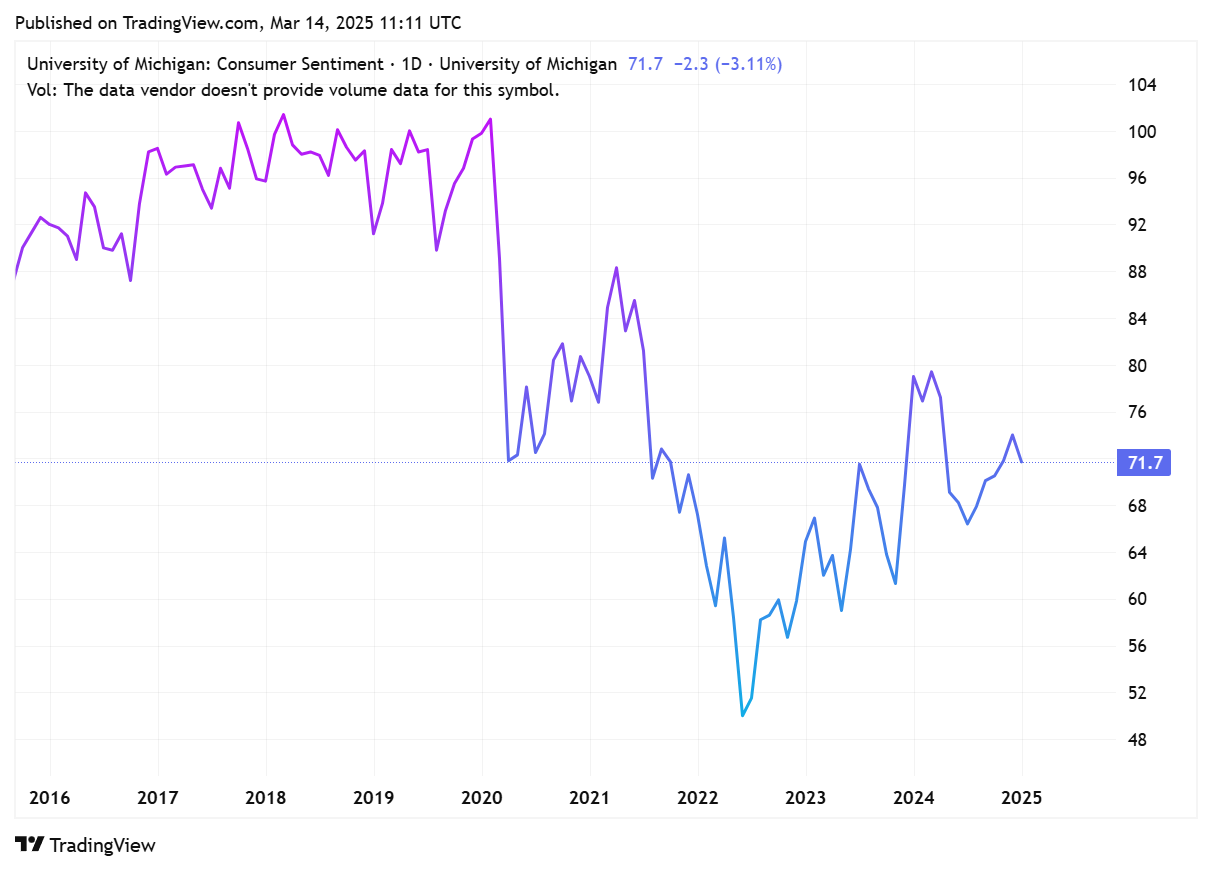 The next release of the Michigan Consumer Sentiment Index is scheduled for today, at 10:00 AM EDT. This release will provide the preliminary results for March 2025. The index is currently at a level of 64.70, which was reported for February 2025, showing a decrease from the previous month and year.