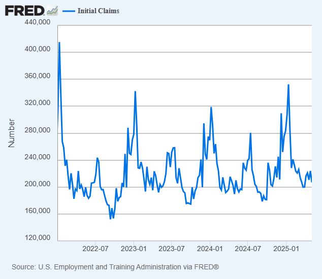 While the labor market shows signs of resilience with the recent drop in initial claims, the elevated levels compared to earlier months suggest some caution as economic uncertainties, such as tariffs and mixed growth signals, continue to affect employment dynamics.