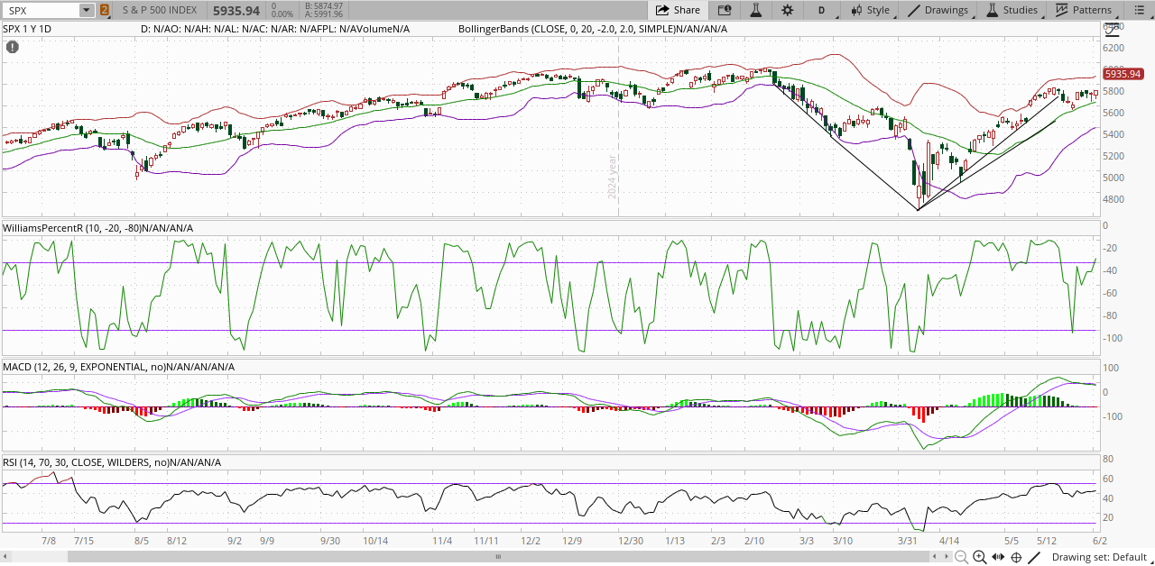 The S&P 500 continues to exhibit robust technical health, underpinned by bullish moving averages, supportive RSI readings, and a constructive MACD profile. The index is probing upper resistance levels, with Bollinger Bands and Williams %R suggesting the uptrend is intact but not yet overextended. Short-term, the market may see consolidation or minor pullbacks as it digests recent gains, especially if it approaches the psychologically significant 6,000 mark. However, as long as the SPX holds above key support levels—particularly the 50-day and 200-day moving averages—the broader upward trajectory remains credible.
