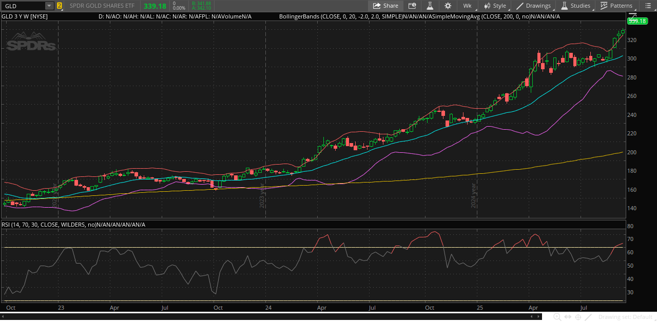GLD is currently trading significantly above its level of around $280 at the beginning of April 2025. The upward trend, which began in August, has continued steadily, reflecting strong momentum in gold prices.