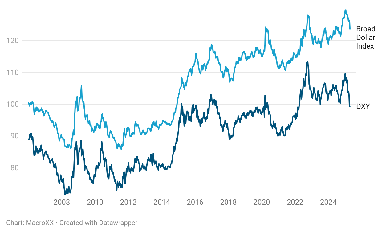 Breadth: DXY is more limited, covering only 6 developed market currencies, with the euro making up over half the index. The Fed’s Broad Dollar Index is more comprehensive, including 26 currencies, and better reflects the full spectrum of U.S. trade relationships.
