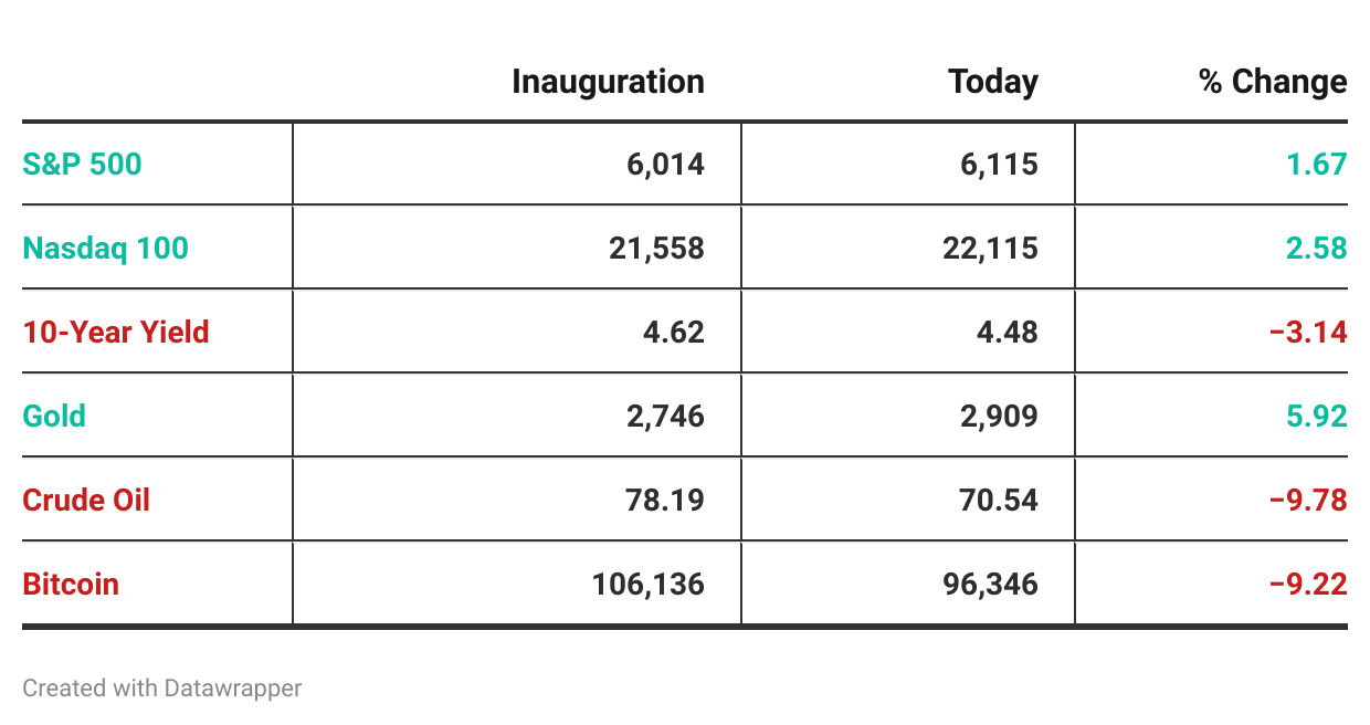 Since Donald Trump's inauguration on January 20, 2025, financial markets have shown mixed but notable trends across various asset classes