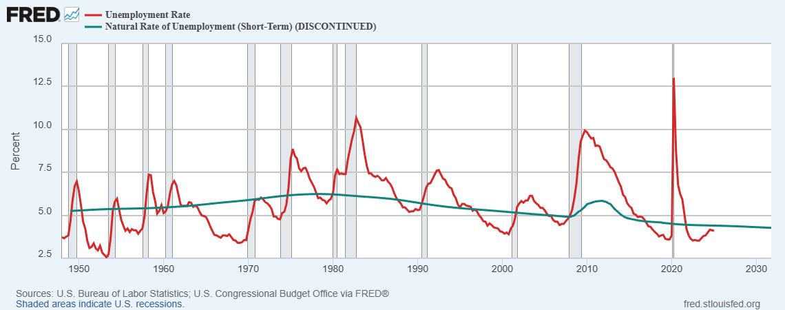The Natural Rate of Unemployment is the lowest unemployment rate that can be sustained in a healthy, growing economy without causing inflation to rise. It’s sometimes called the “full employment” unemployment rate, but don’t let that fool you—it’s not zero! The natural rate includes people who are temporarily between jobs (frictional unemployment) and those whose skills don’t match available jobs (structural unemployment).